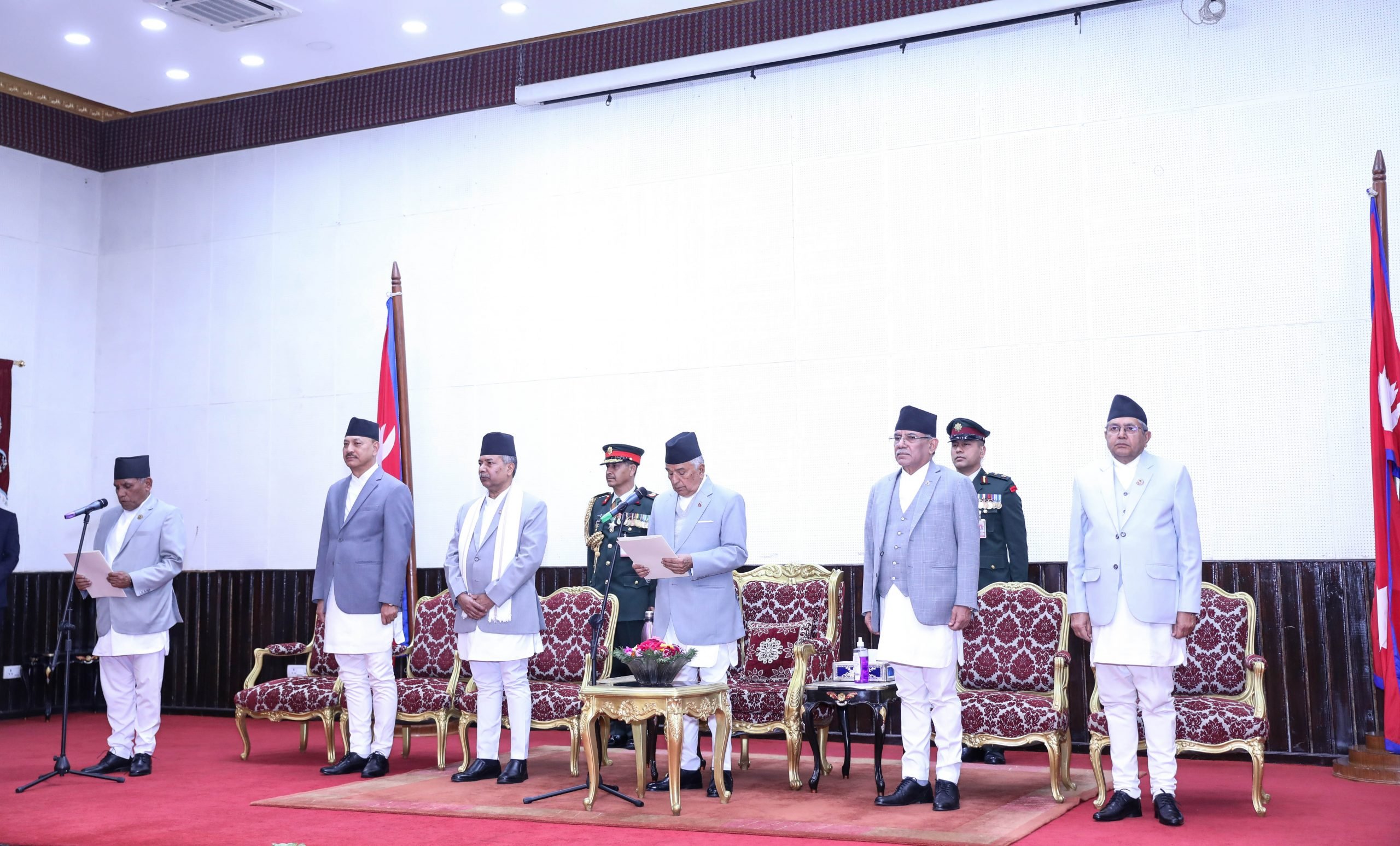 काठमाडौं, २३ फागुन । राष्ट्रपति रामचन्द्र पौडेलले शितल निवासमा नवनियुक्त मन्त्रीहरूलाई शपथ गराएका छन् । प्रधानमन्त्री पुष्पकमल दाहाल प्रचण्डले पुनर्गठन गरेको मन्त्रिपरिषदमा नेकपा एमालेका सचिवसमेत रहेका रघुवीर महासेठले प्रधानमन्त्रीपछिको वरीयता क्रममा उपप्रधान तथा भौतिक पूर्वाधार मन्त्रीको शपथ लिएका छन् । ...